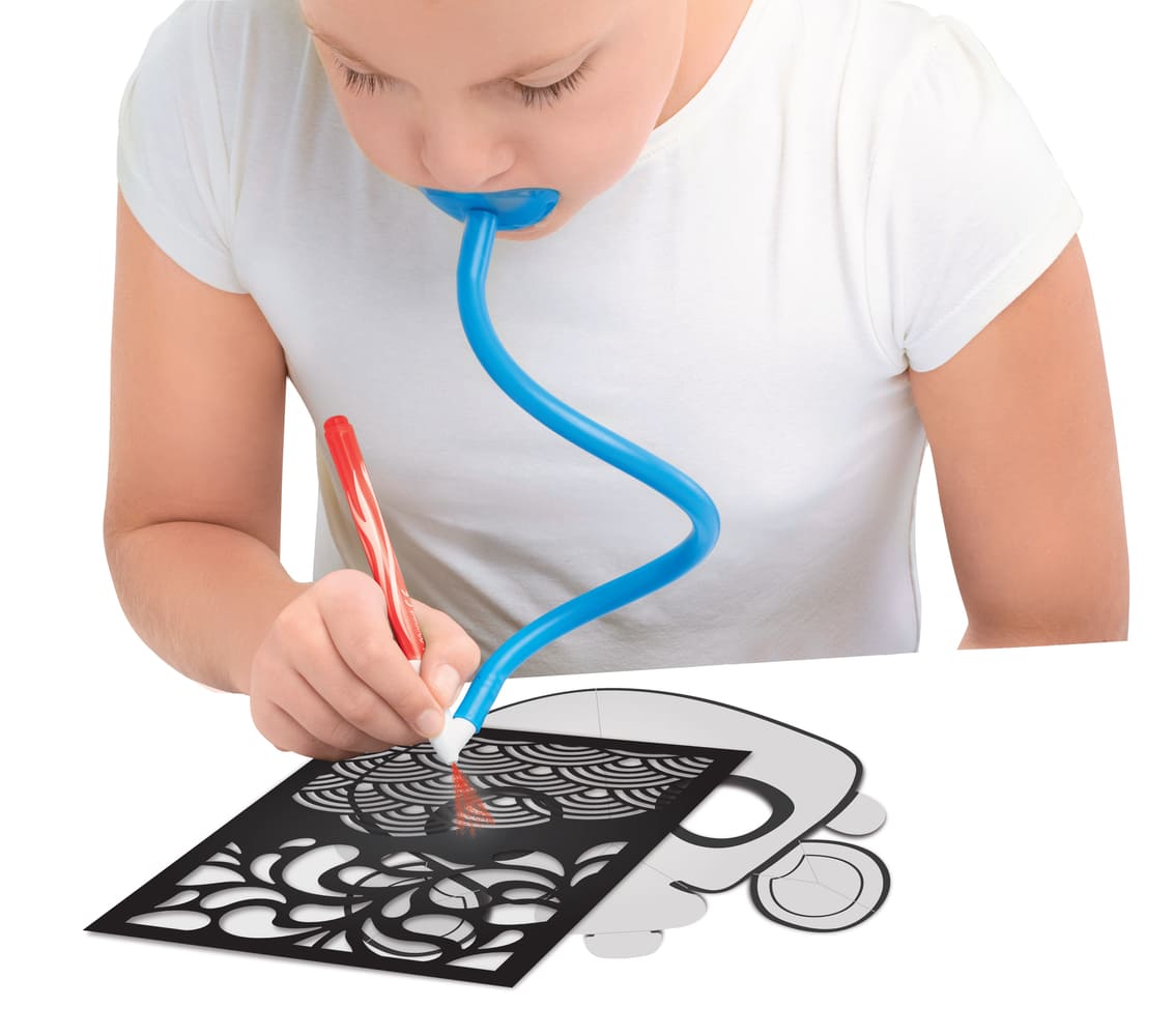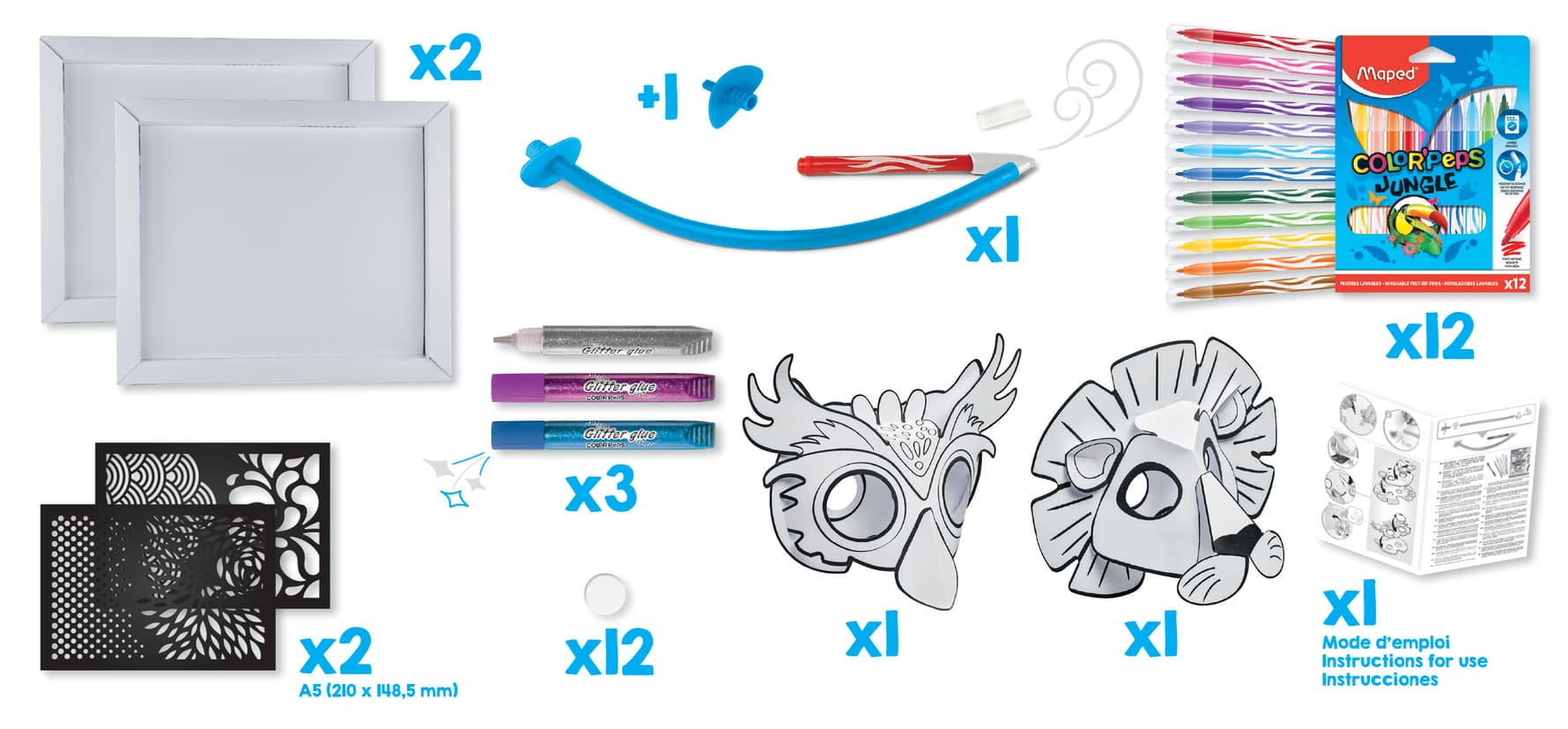 Vous y trouverez des stylos à souffler, un tube et des pochoirs.