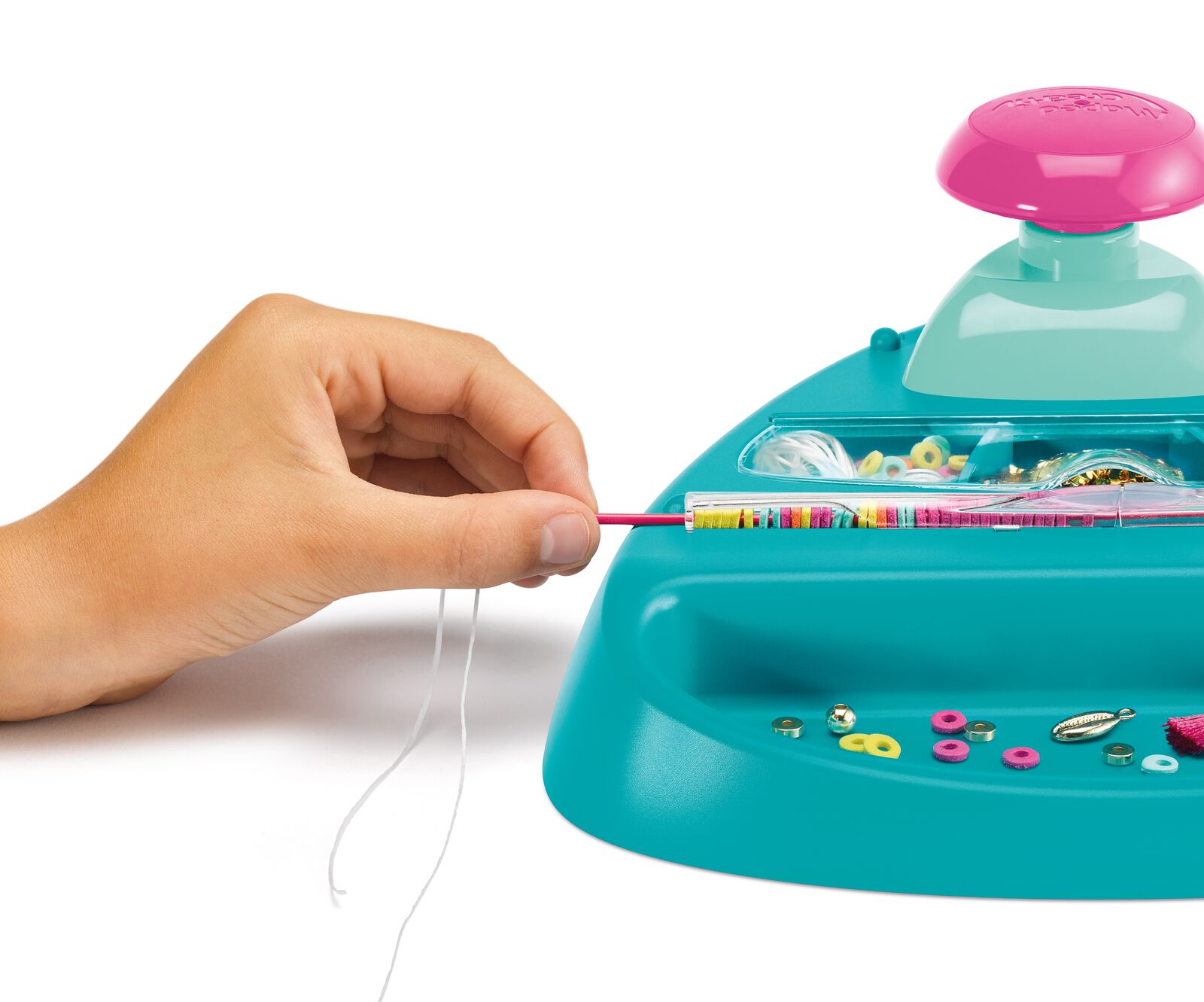 Le coffret de création de bijoux enfants Bracelets Maker contient : 1 machine, 1 aiguille, 500 cm de fil élastique, 8 feuilles EVA (pour faire plus de 1 500 perles), 6 pompons, 4 breloques, 20 séparateurs Heishi dorés, 10 perles rondes dorées. Fonctionne sans pile. Dès 6 ans.